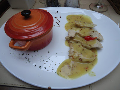 Experimentamos filezinhos de frango ao molho de mel e mostarda Dijon, acompanhado de arroz com amêndoas torradas. Para a sobremesa tivemos maçãs com calda de especiarias com sorvete de creme.
