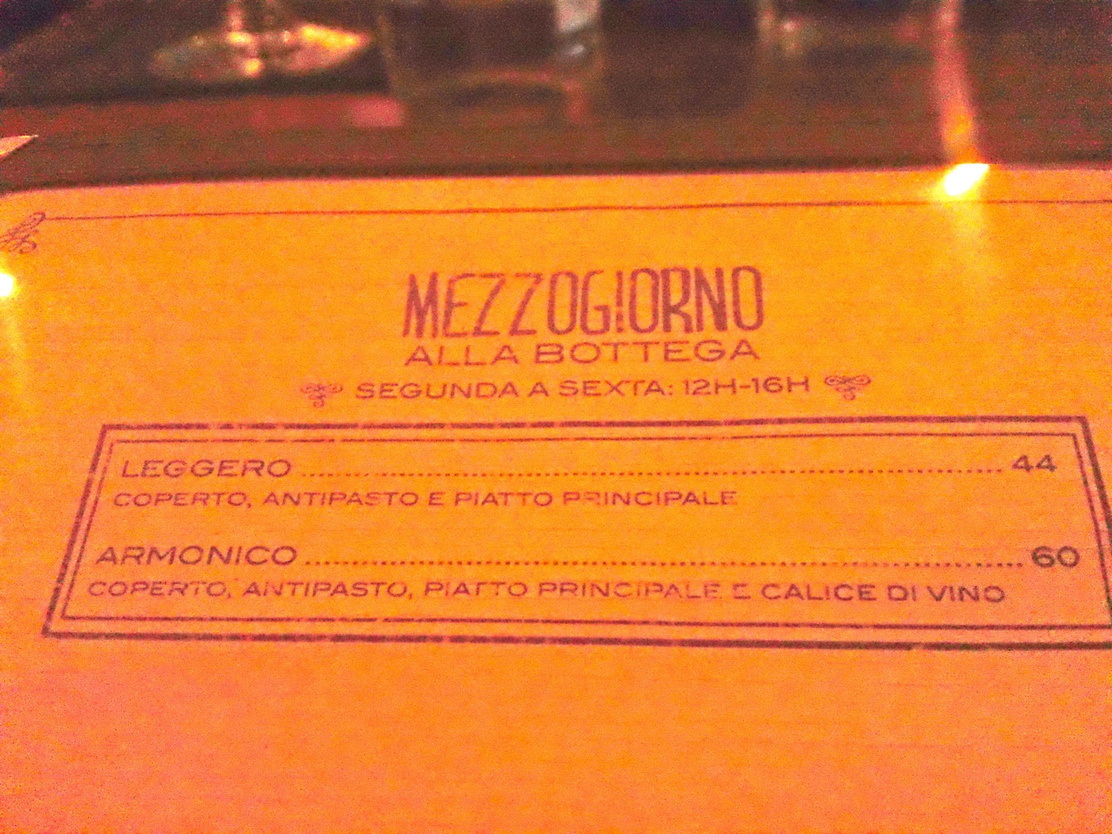 O cardápio é feito em parceria por Nicola Giorgio e o chef da casa, Pedro Pecego, e traz clássicos da cozinha italiana como massas, saladas, terrines, carpaccios e porções de queijos importados. Na hora do almoço, de segunda a sexta, entra em cena o menu del giorno, com couvert, entrada e prato principal a preço fixo, com a opção de uma taça de vinho para harmonizar.