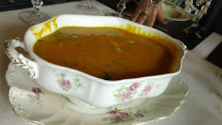 Mas, vamos ao melhor da festa, o que ele preparou para degustarmos, uma deliciosa sopa creme de moranga, gengibre e camarões,seguido por um lombinho com molho de jabuticabas do quintal e batatas assadas ao creme. Como estávamos com saudades destas delícias. Para a sobremesa uma taça de chocolate crocante, bananas picadas e chantilly de café. Licores, e aquele café cheiroso e gostoso que só ele sabe fazer.