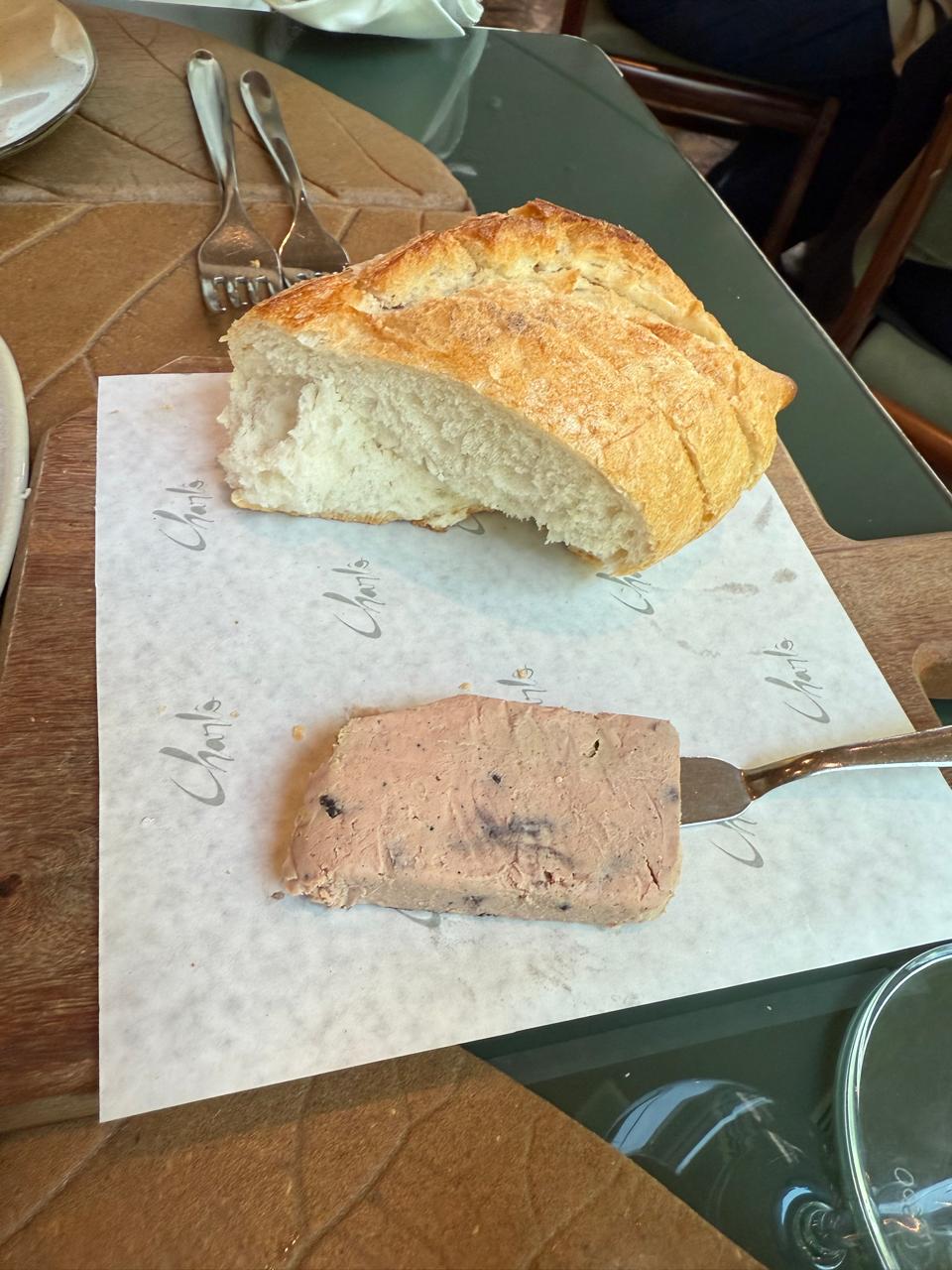 O couvert muito bom, com baguete, chips de algas e um patê delicioso.