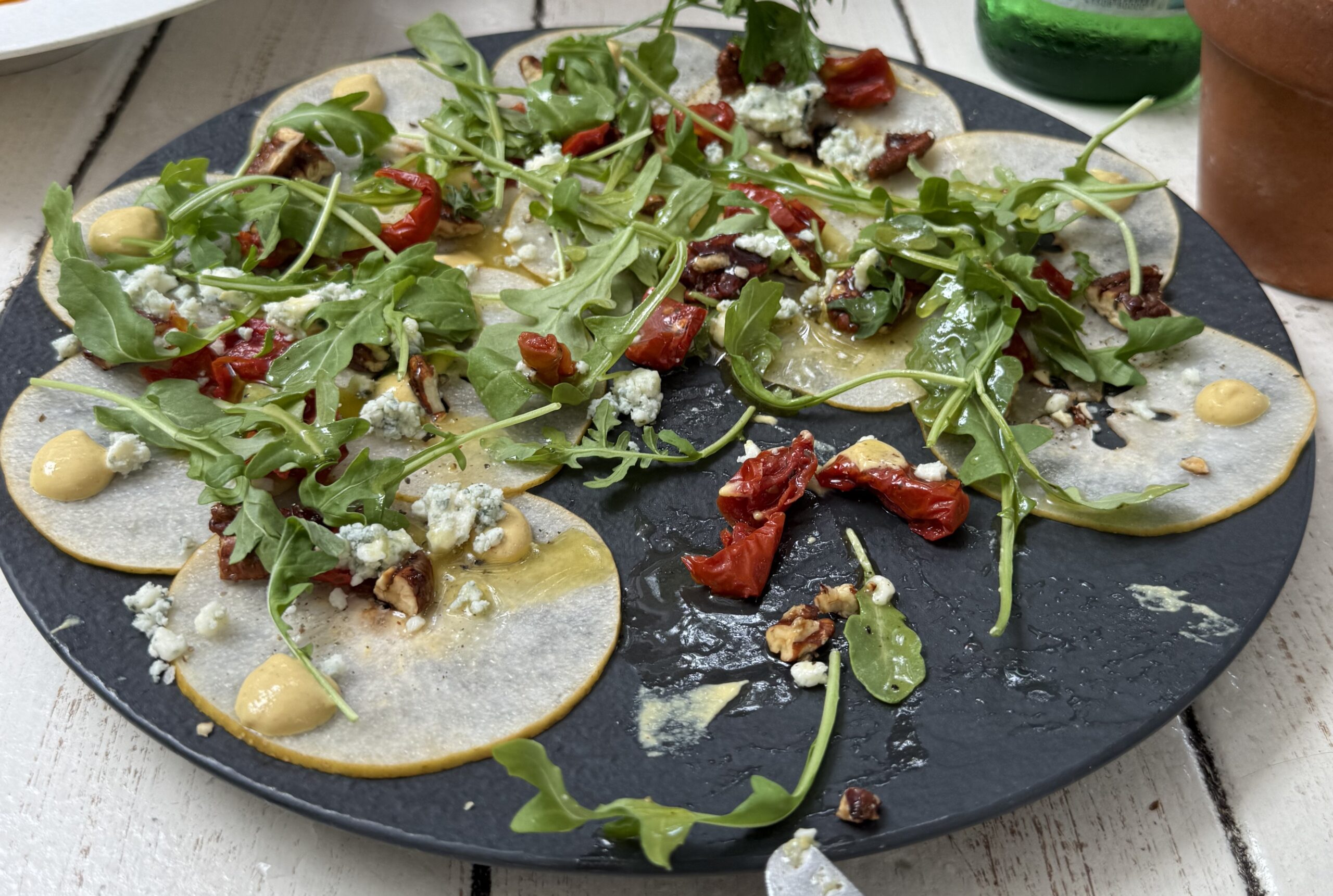 Desta vez, fui no Call me Gaby em South Beach e pedi de entrada sem muita pretensão, um carpaccio de pera!
