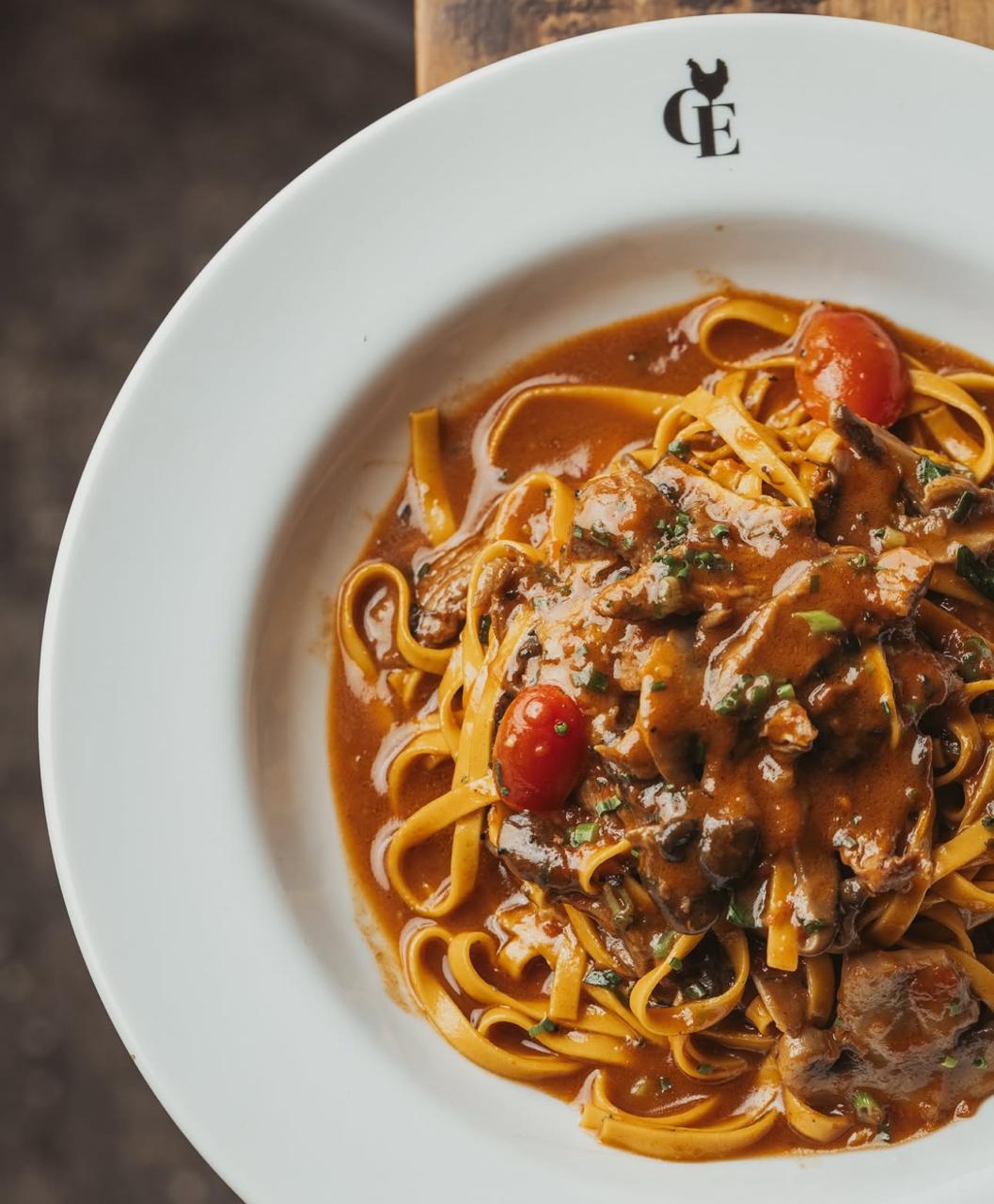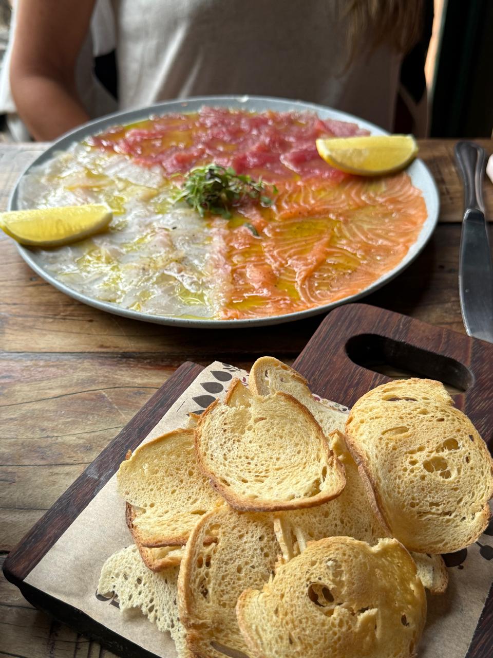 Um carpaccio de 3 peixes frescos, bem apresentado e fettuccine com iscas de filé, tomatinhos e cogumelos.