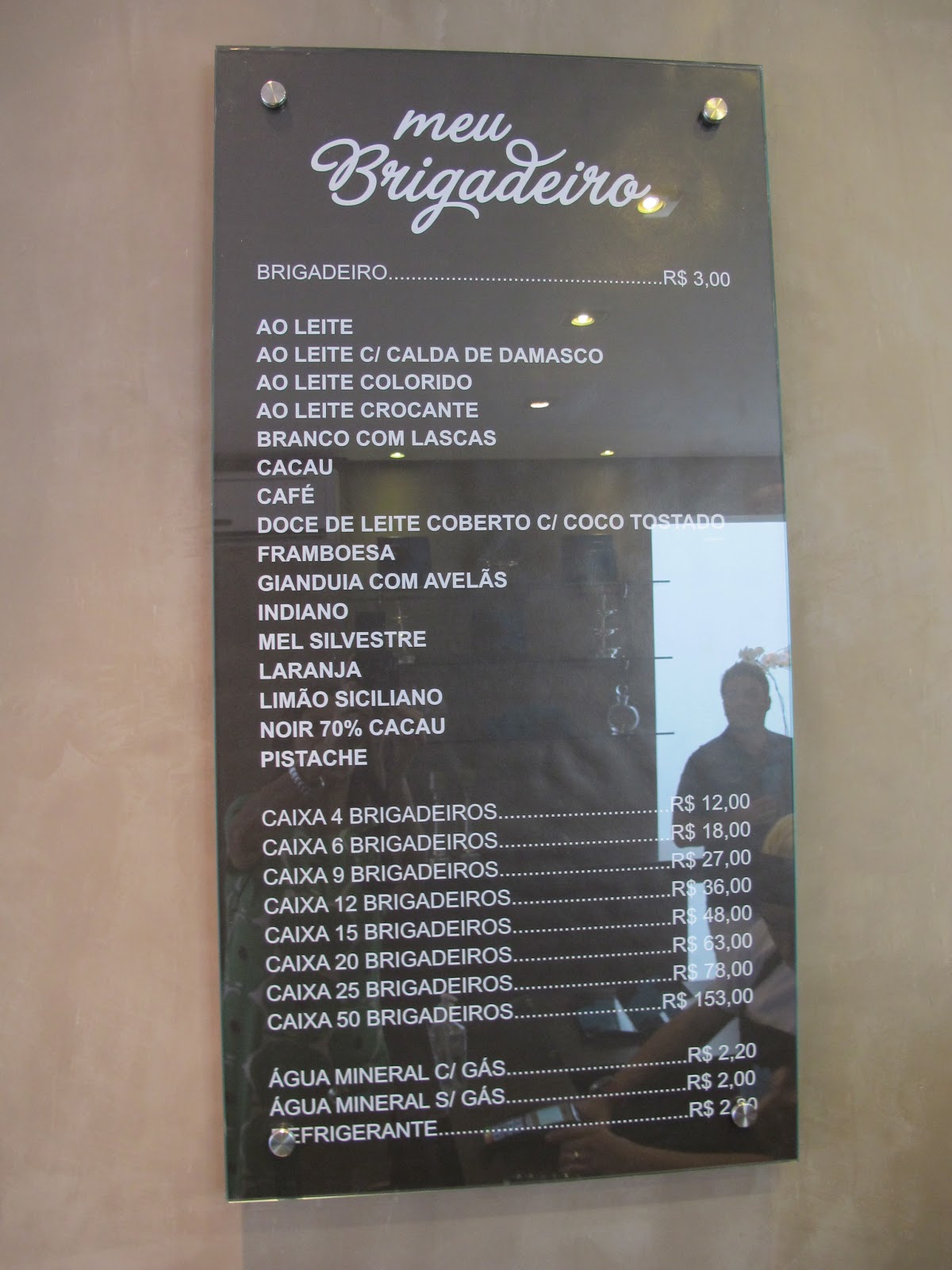 Na parede um cartaz mostra a variedade do cardápio, vários tipos de brigadeiro, que são boleados na hora!! Acima você pode conferir as especialidades. Eles são fresquinhos, saborosos, derretendo na boca, huuuummm…