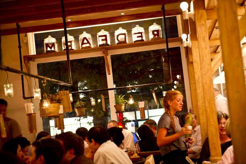 Menus, pauzinhos, flores e velas dependuras sobre tubos rústicos vindos do teto se agregam às mesas comunais.